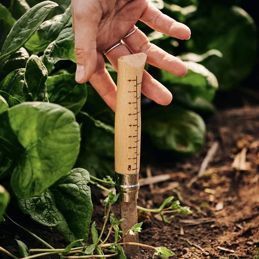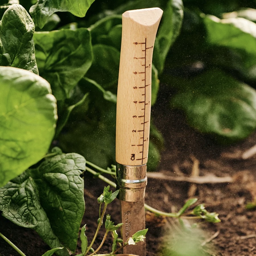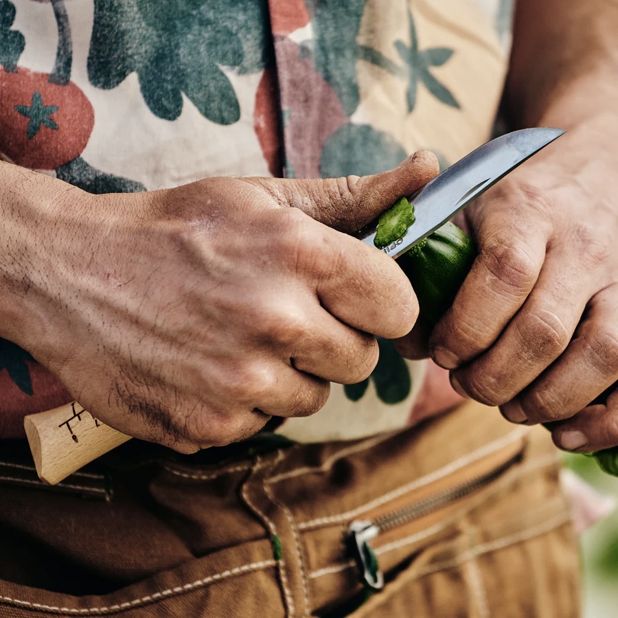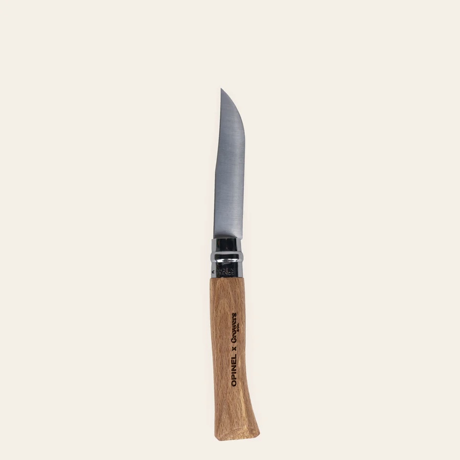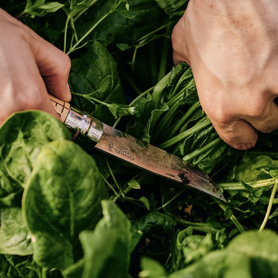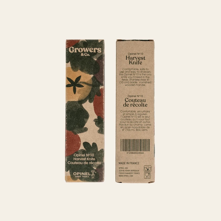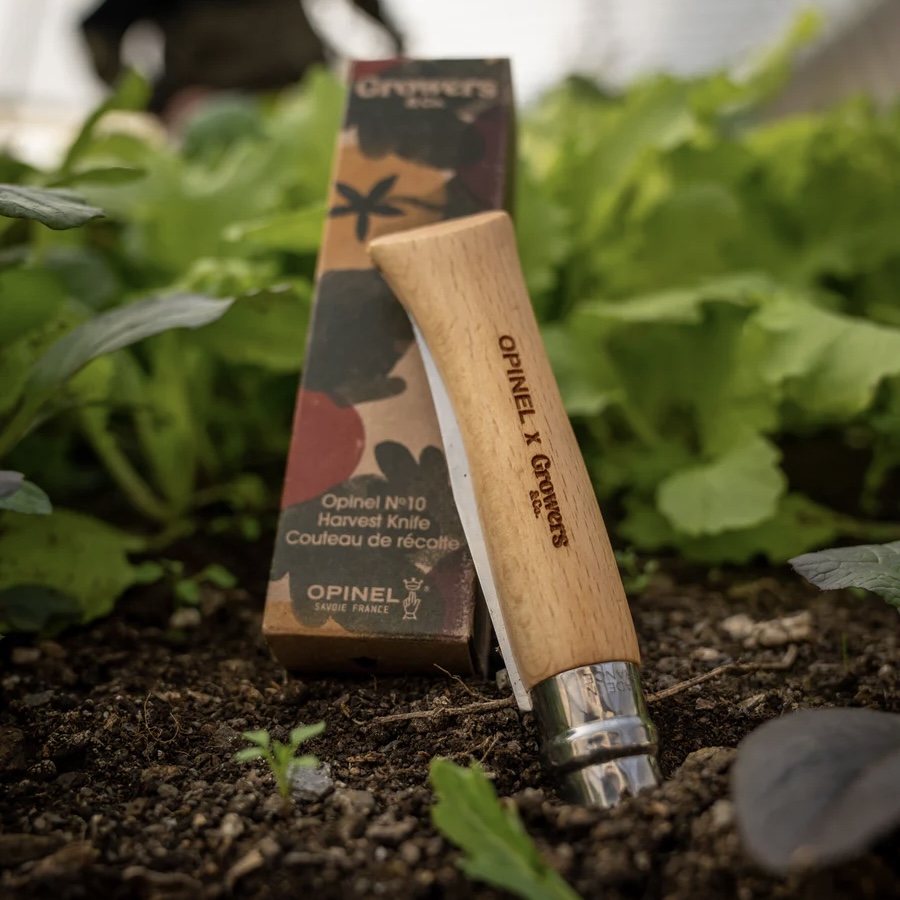 Som favoritten blant økologiske dyrkere og gartnere over hele verden, er Opinel nr. 10 den eneste kniven du trenger når du høster grønnsaker. Kniven har et 10 cm blad i rustfritt stål og et håndtak i lakkert bøketre, og er utstyrt med et spesielt komfortabelt grep og en låsering som forhindrer utilsiktet lukking. Som en ekstra funksjon har Growers & Co. inngått et samarbeid med Opinel for å gravere metriske og britiske mål på treskaftet for å hjelpe dyrkere med å sortere og måle grønnsaker direkte i åkeren.